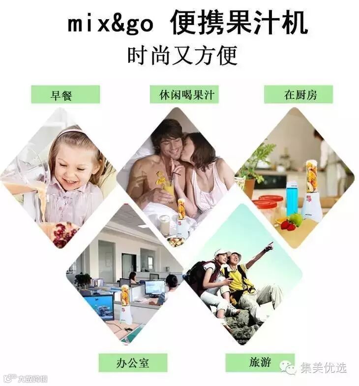 1搅拌机 +2瓶子 Mix&Go便携式榨汁机 榨完直接拎走去上班 不需要清洗机器 喝完果汁洗净杯子就可以了只需要1分钟 每天都能随时喝到新鲜果汁 源源不断的维生素 想不变漂亮都难哦 适合想偷懒又要过健康生活的你们。可做水果沙冰、果蔬汁、健康奶昔、宝宝的辅食等