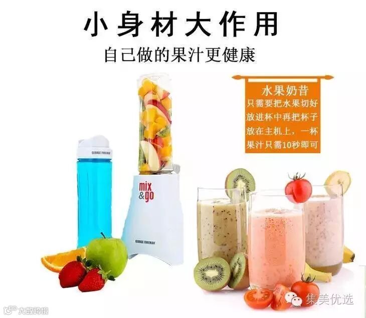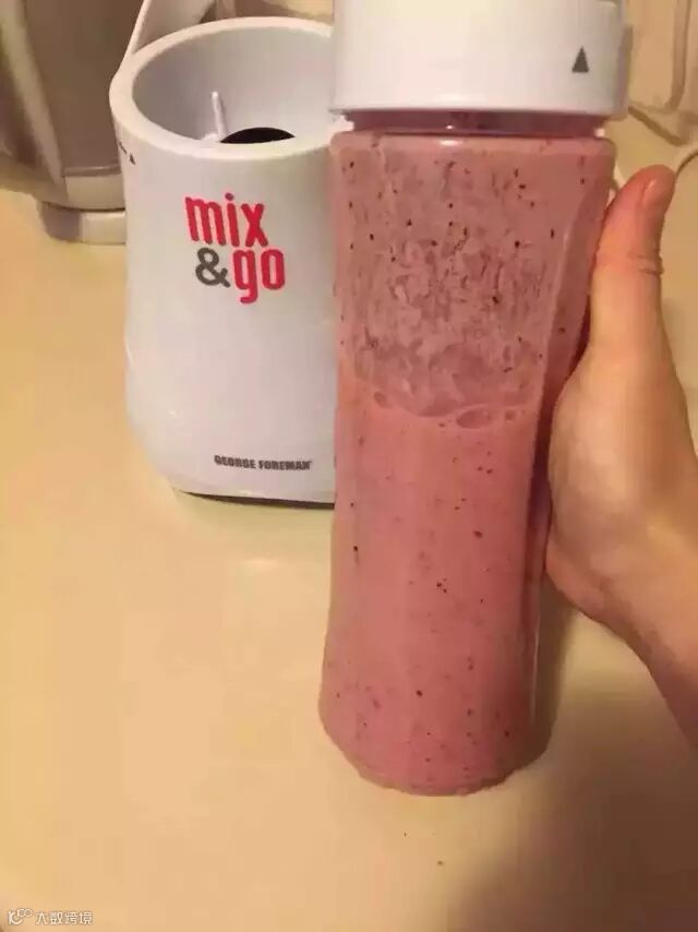 【使用方法】: 1.准备新鲜水果和George Foreman mix n go果汁机。 2.把水果切块,可加入牛奶/水/冰块,和蜂蜜。 3.放在机器上进行粉碎。 4.粉碎完成后从机器上拿下。 5.更换一个盖子即可带出门,方便快捷。 帮助日常微量元素的补充,放入鲜果,搅拌,盖上后即可带走,整个过程不超过3分钟
