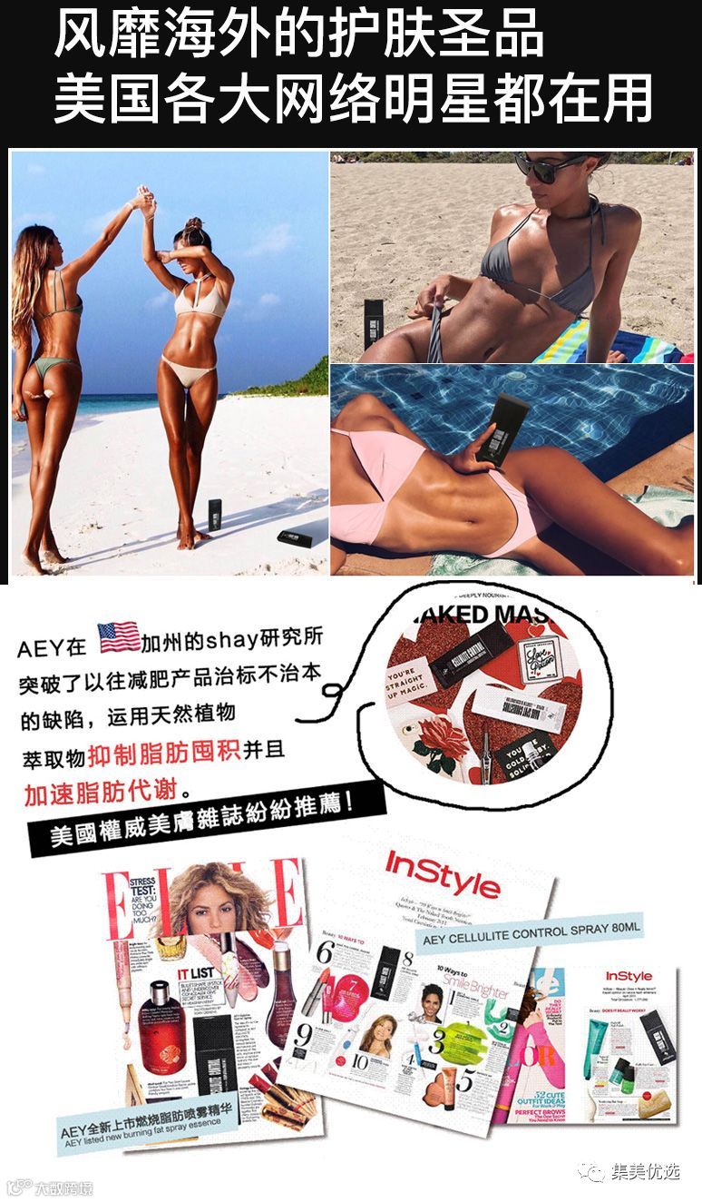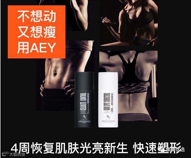 露胳膊露腿的季节到啦是不是特别想减肥但是没有时间去健身房,这款就是你们的救星哦只要喷一喷就可以减脂。Aey燃脂纤体喷雾精华在美国非常火,很多维密走秀的模特都用这款,可以说是性价比超级高的一款瘦身 产品了,普通人都可以用的起哦。而且这款连经期、哺乳期都可以使用,无添加,纯天然,可以说真的相当安全了白膜的美白效果超级棒,补水效果也很好,对于脸上有斑的人简直就是福音,夏天最怕的两件事,一个胖一个黑,都让AEYBeaut全解决了!还在等什么,想要夏季美美的就来买这款吧!