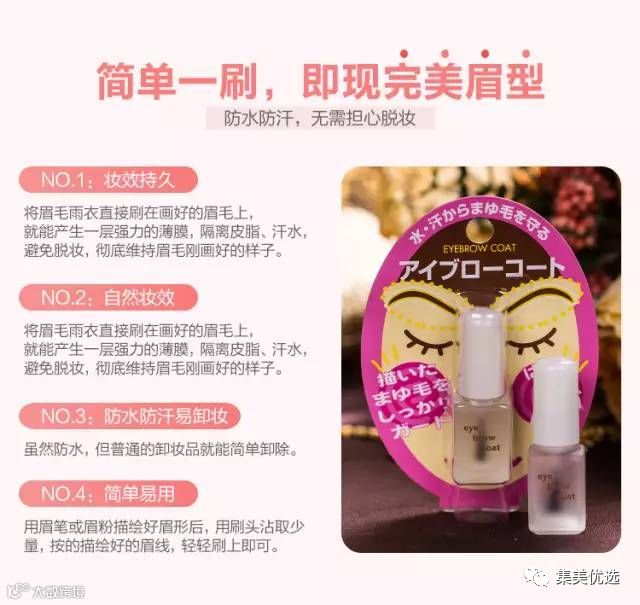 在画上眉笔或者眉粉之后的眉毛上,涂上眉毛雨衣定型液,用量不需要太多,不然很难干,之后可以保持一整天哦!使用普通脸部卸妆产品即可轻松卸除。