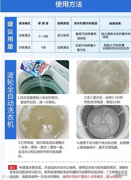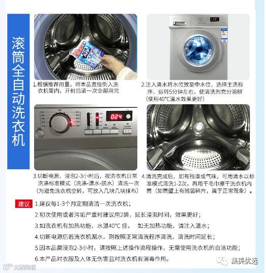 这款清洗剂性能温和,泡沫丰富,渗透力很棒,能够有效地清除沉积在洗衣机筒壁和内槽的污垢。味道也很清新,洗完后能闻到淡淡的香味,而且清洗剂环保安全,不损伤洗衣机内胆,也不会对皮肤产生刺激影响,使用起来很方便。