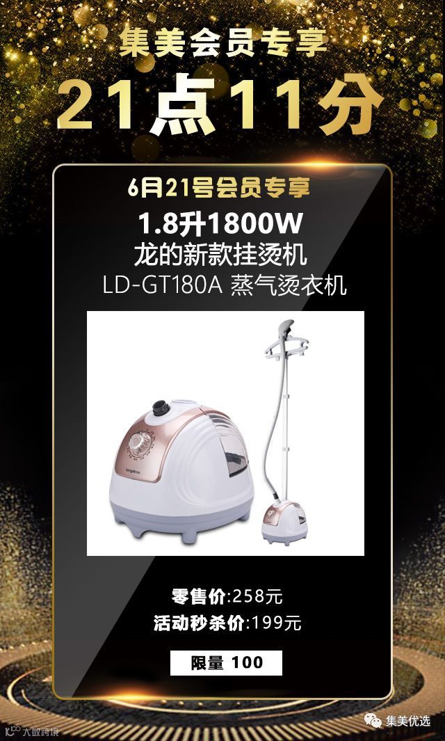 6月21日,21:11,1.8升1800W 龙的新款挂烫机 LD-GT180A 蒸气烫衣机,原价258元,活动秒杀价199元,限量100份,手慢无!!!