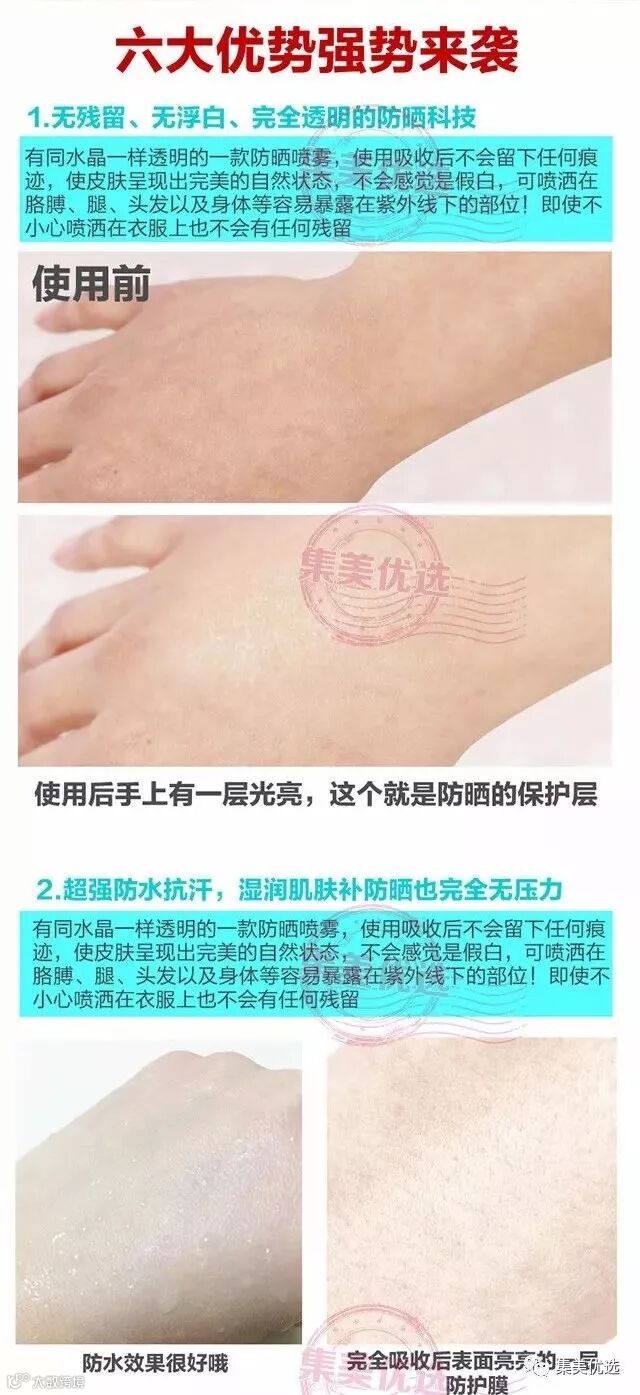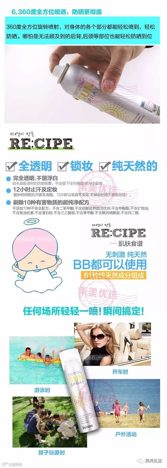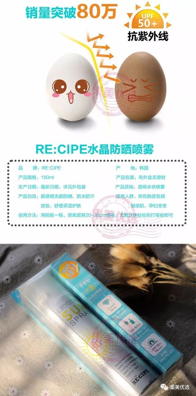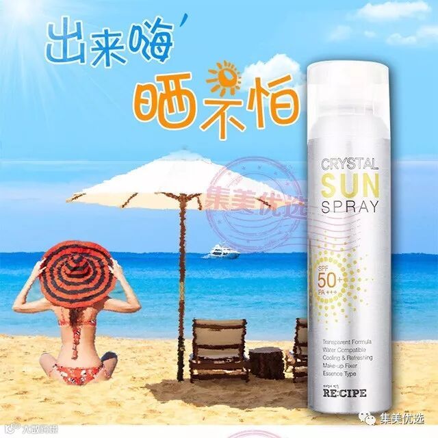 RE:CIPE水晶防晒喷雾,非常清爽,完全不留白,50+PA+++防晒,清爽好吸收同时还可以定妆,有镇定肌肤降温的功效。360度无死角的喷头设计,质地十分轻盈,即使不小心喷在深色的衣物上也完全不留白点。用后皮肤会像水晶一样,晶莹水嫩,闪闪发亮。既能满足混合性肌肤功能齐全的要求,又满足油性肌肤的清爽要求,也能保持干性肌肤的平衡,完全不对过敏性肌肤造成任何的安全隐患。