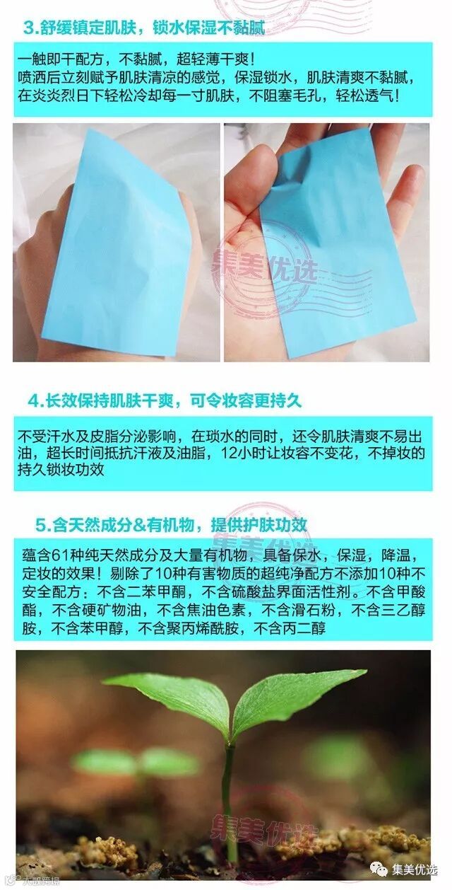 定妆:妆后轻轻一喷,轻松定妆,高温也不怕溶妆