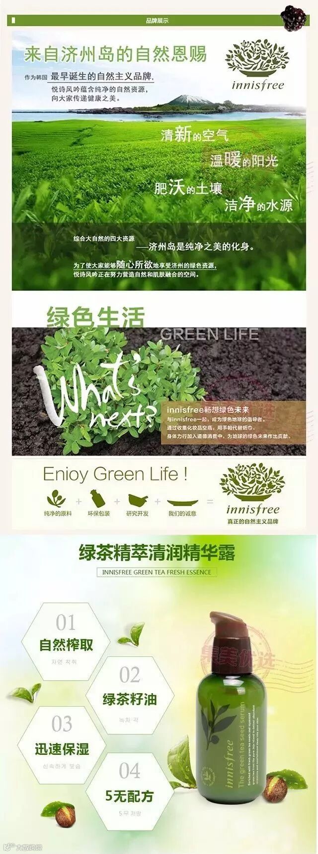 绿茶系列一直延续着一股小清新风,仿佛济州岛有机绿茶园里一眼望不到边的绿色。淡淡的绿茶香,啫喱状的精华。使用起来凉凉的,水水的,轻薄的一层吸收的很快,感觉肌肤一下子就喝饱了水,补水保湿却又不油腻,爽控油。