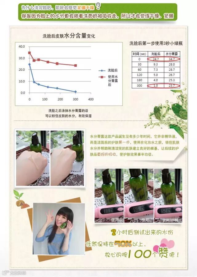 悦诗风吟小绿瓶又称三秒补水小绿瓶!质地清爽,味道清淡,擦在脸上真的感觉肌肤3秒就喝饱了水,皮肤感觉有弹性而且完全不会感觉厚重,使用时比较像润肤水,但又有凝露的浓稠感~水润的质地拍在脸上很快被吸收,真的很水,保湿效果是一般精华液的5倍!瞬间吸收不油腻!
