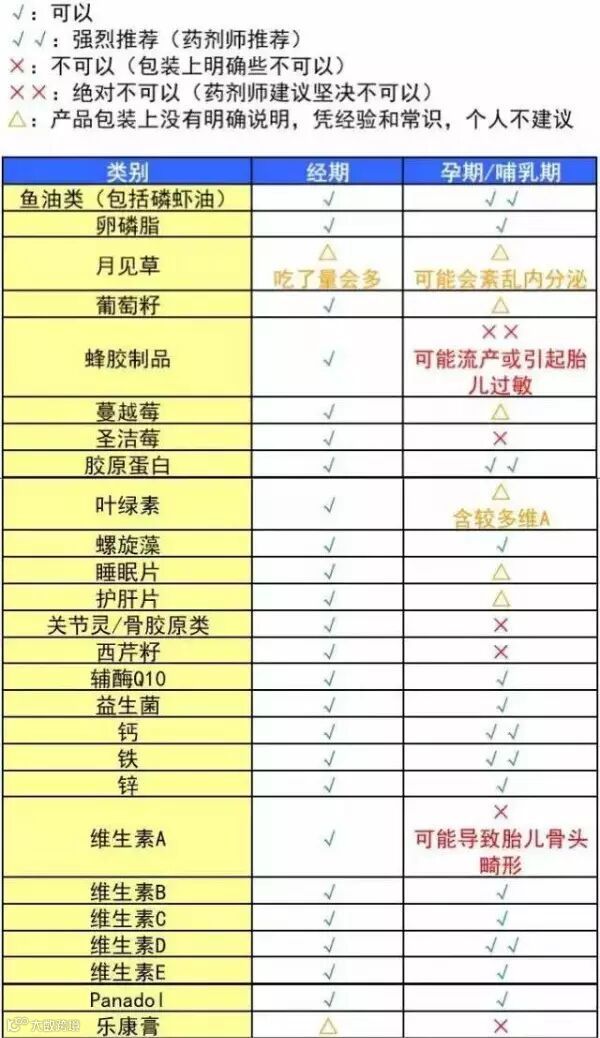 澳洲的保健品近年来以过硬的品质和功效赢得了越来越多的人们的喜爱和信赖,但是对于处在经期和孕期或者哺乳期的服用禁忌问题,也是大家最近非常关注的问题。今天就跟大家介绍下一些主要的保健品,是否适合您服用,大家可以参考一下表格: