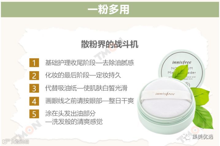 悦诗风吟散粉〰大油脸看过来~~Innisfree悦诗薄荷散粉草本矿物质控油蜜粉5g一款专门针对油性皮肤设计的控油产品,涂出来是透明的效果,专为控油,没有遮瑕和调节肤色的作用。油皮M们是不是在为每天顶着个大油田而烦恼是不是因为出油毛孔越来越粗大是不是每次上妆都觉得不服帖,这一款就适合大油田皮肤