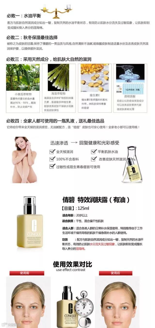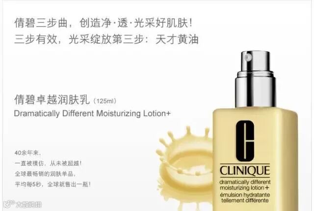 倩碧(Clinique) 卓越润肤乳125ml,有效防止肌肤水分流失及过敏现象,配方与肌肤自然滋润成分如出一辙,复制天然的水油平衡状态,让肌肤即刻变成擅长导入养分的湿海绵。