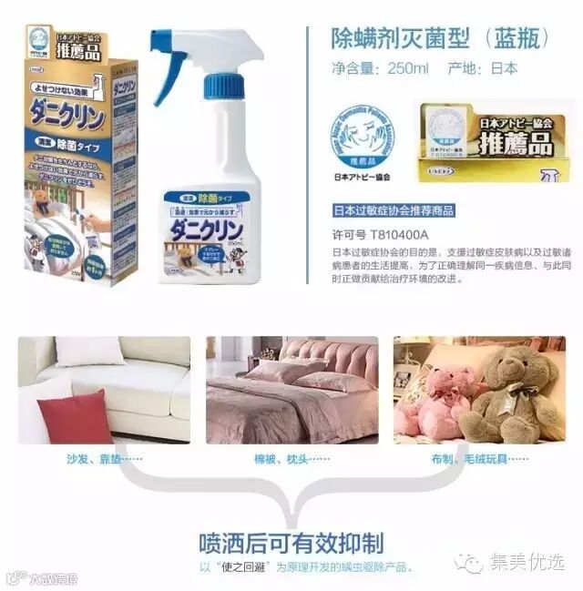 它是日本过敏症协会推荐的产品。不含杀虫剂的除螨产品,天然安全效果好,零污染零刺激。