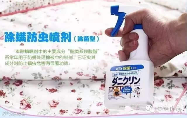 除螨喷剂中的主要成分“脂类系羧酸酯”被用于棉被中作防螨处理的制剂,已证实其成分对防止螨虫危害有显著功效。