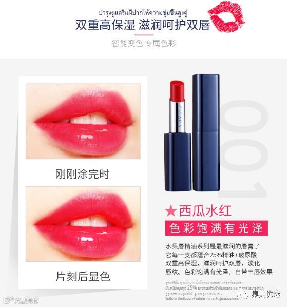 西瓜水红作为一个非常火爆的色号,泰国悠婵CICADA口红不负众望,很容易驾驭,蕴含25精油+玻尿酸双重高保湿,滋润呵护双唇,自带丰唇效果,淡化唇纹,很好涂抹,持妆度良好,色彩饱满有光泽,上色可以表现出雾面的感觉,哪怕是皮肤偏黄的妹子也能hold住,很适合日常的淡妆,优雅中带点活泼,而且还显牙白哟。不仅白皮妹子涂了更白皙,散发青春活力,元气满满,更是黄皮妹子的救星,让黄皮瞬间有朝气!