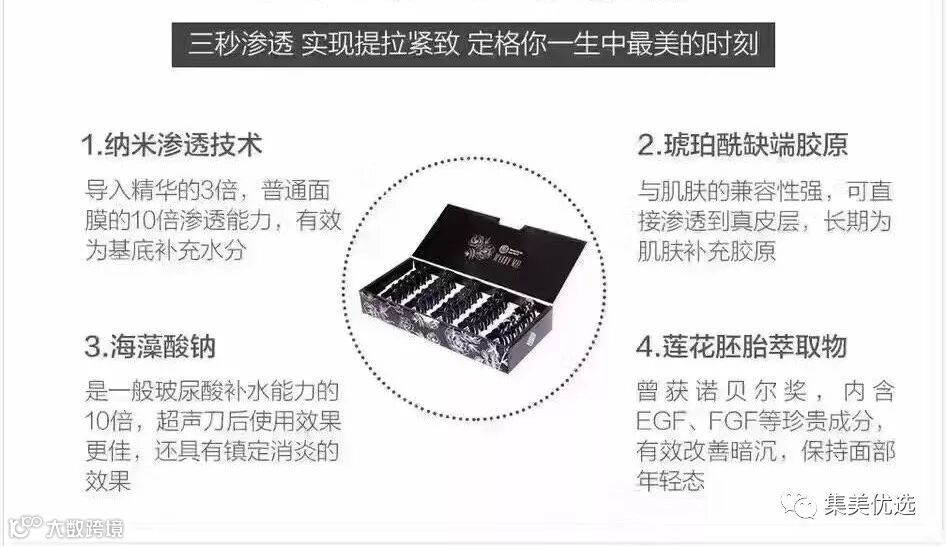 改善抬头纹、法令纹、颈纹等问题,集中密集护理。吸收率是普通面膜的10倍,是导入精华的3倍,睡前涂完之后苐二天皮肤水润精致,如同做完超声刀后的效果哦,一盒30颗,一颗脸部用不完的话也可以连脖子一起保养哦。