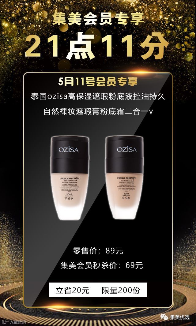 5月11日,21:11,泰国ozisa高保湿遮瑕粉底液控油持久自然裸妆遮瑕膏粉底霜二合一,原价89元,建议零售价69元,限量各100份,手慢无!!!