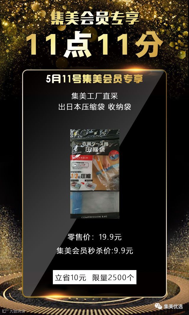 5月11日,11:11,集美工厂直采 出日本压缩袋 收纳袋,原价19.9元,建议零售价9.9元,限量2500份,手慢无!!!
