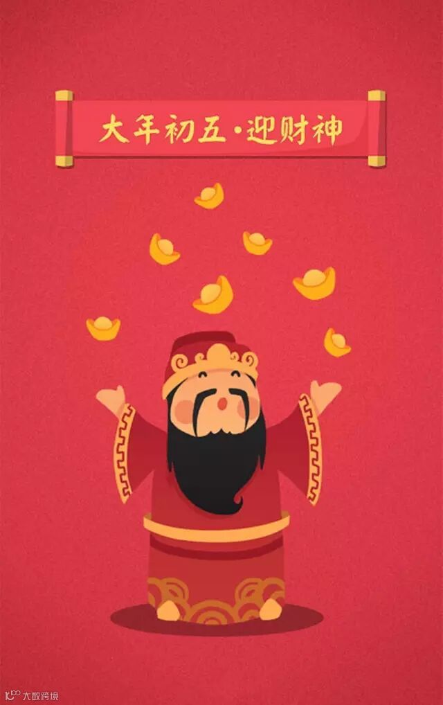可见,正月初五是五路财神按方位查察,记录善恶以凭赏罚。而赵元帅的诞辰在农历三月十五日。所以,正月初五,接财神我们接的财神是玄坛赵公明和其部下五路财神。