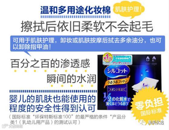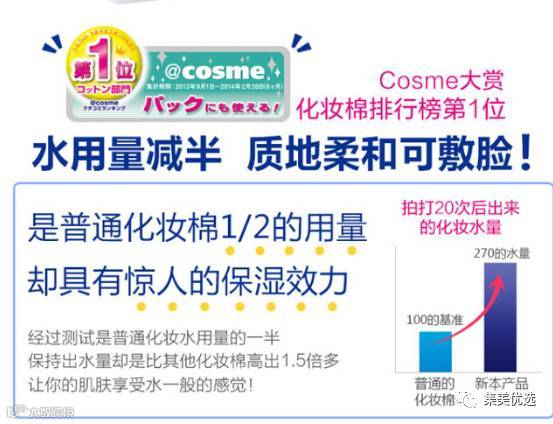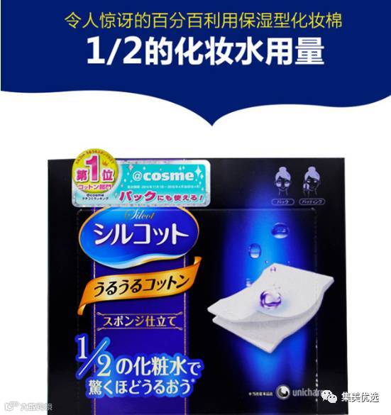 COSME排行榜第一名,尤妮佳化妆棉采用新开发的海绵,非常保湿,百分百利用,让你的化妆水不再浪费!能让你的肌肤享受水一般的感觉,就算是非常少量的化妆水,也可以让你的肌肤完完全全的渗透进去!渗透到你的肌肤之中,就算只剩一点点的化妆水,也能让你的肌肤感受到吹弹可破的感觉!