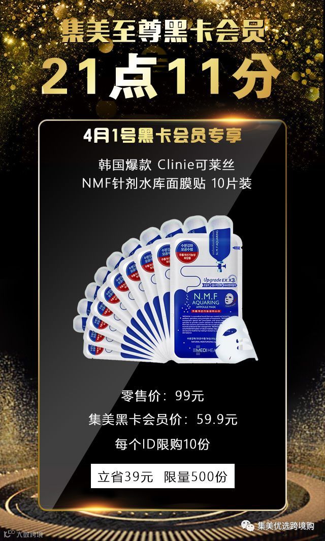 4月1日,21:11,在集美会员专享,只需要59.9元就可以买到正品韩国爆款 Clinie可莱丝 NMF针剂水库面膜贴 10片装,立省29元,限量500份,手慢无!!!