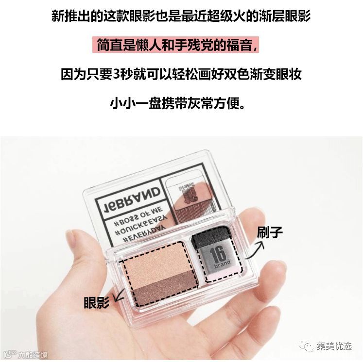爆了 韩国刷爆ins的16brand懒人眼影,双色眼影!拯救手残党必备神器懒人专用!只需3秒就能画完!能多睡半小时绝不早起,一分钟可爱的外形很有新意,日常的配色加上非常方便的上妆方式,能快速完成日常眼妆。重要的是:价格也很实惠! 经典大地色系,刷子的设计也很有新意,可以十分快速的完成眼妆,适合懒人使用,刷毛细腻柔软,能很好的晕染眼影。用刷子直接取两色眼影,刷上眼后,只要稍微晕染一下边界,带过眼下,然后画上眼线和睫毛膏就能简单完成一个日常眼妆。