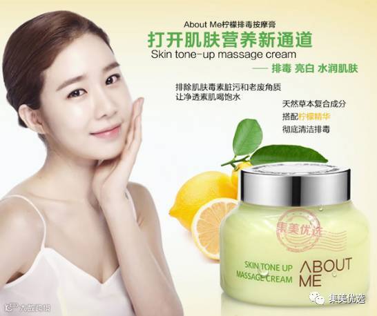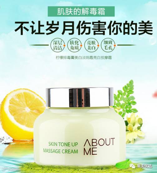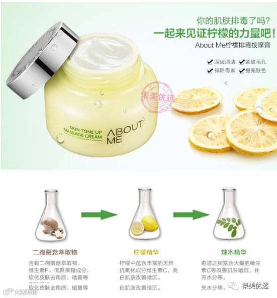 About Me柠檬排毒膏,排毒去黄神器!5分钟揉出泛黄毒素!!ABOUT ME里面含有排毒胶囊和柠檬成分,其中排毒胶囊特殊的海绵化学成分在按摩过程中可以吸附和中和皮肤内40倍以上的毒素和老化物,同时还在按摩的过程中促进血液循环,使用一次就可以看到肤色的改善效果,擦出来的不是化学反应显现的死白哦,非常通透性的自然亮白。
