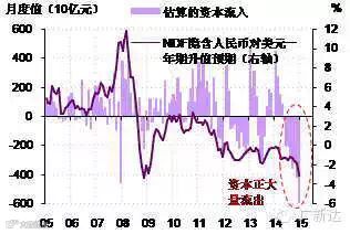 人民币的贬值压力伴随着资本的流出。用外汇占款、贸易顺差等数据可以估算出,2014年12月我国单月资本流出达到了创纪录的6千亿元。而在2013年6月“钱荒”的时候,我国一个月的热钱流出也不过3千亿元。考虑到目前仍然较强的贬值压力,近期资本流出的规模也不会小(图3)。