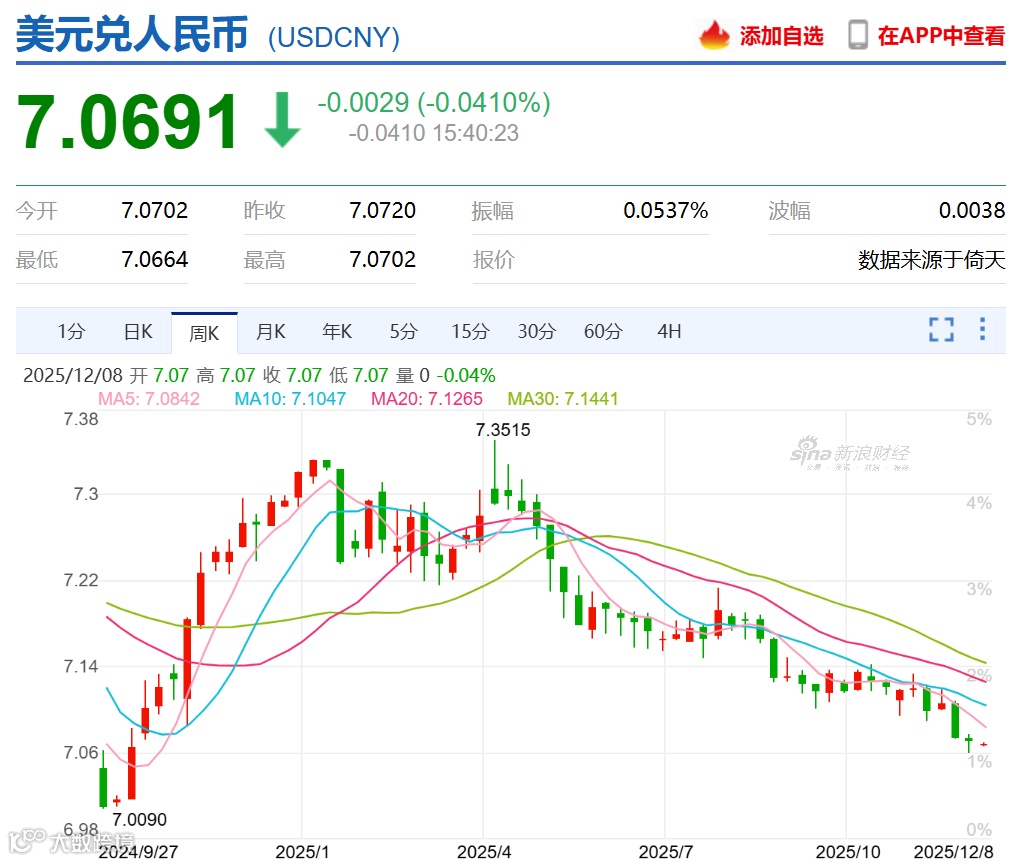 12月第一周,人民币即期直逼7.05关口,预计将实现五年来最为强劲的年度表现。已经听到有一些外贸人在担忧,年底人民币会破7吗?