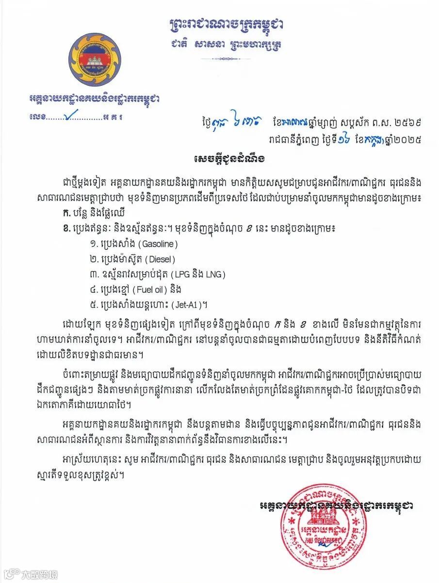 通告明确指出,此次全面禁令旨在对泰国方面近期单方面关闭多个柬泰边境国际及地方口岸的行为采取反制措施。