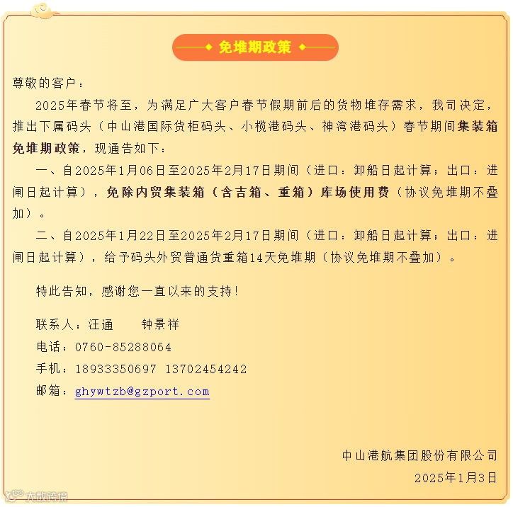 关于春节期间集装箱免堆期政策的通知