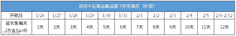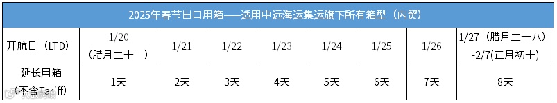 春节将至,在2025年春节长假期间,中远海运集运秉承优质服务的传统,为您贴心提供中国大陆地区出口特殊免箱期服务,提供更充裕的时间、更低的成本,令您可灵活安排假期前后的货物运输,详情如下: