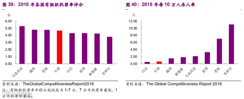 从有组织的犯罪率来看,根据 2018 年《全球竞争力报告》,中国评分为 4.6 分(分数越高说明犯罪率越低),与越南和老挝接近,低于马来西亚, 而印尼、泰国、柬埔寨、菲律宾等国有组织犯罪率则明显高于中国。