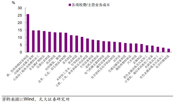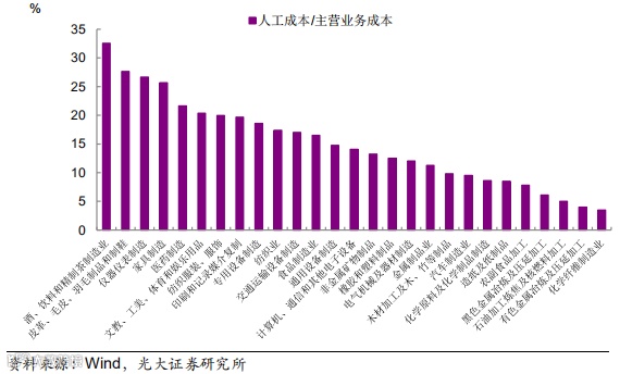 从人工成本占比来看,烟酒制品、皮革制品、仪器仪表制造、家具制造、文娱用品制造、医药制造、纺织服装、印染制品、纺织业靠前。