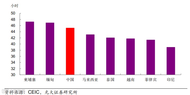 从每周工作时长来看,以2017数据为准,中国每周工作时长是45 小时,高于中国的国家为柬埔寨和缅甸,工作时长是 47 小时,其余国家每周工作时长均比中国低,其中印尼每周平均工作时间仅为 39 小时。