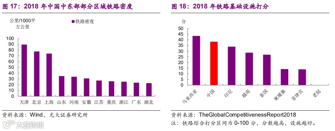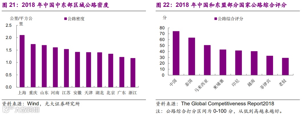 从中国中东部区域公路密度来看,均在1.0公里/平方公里以上,明显要高于东盟八国。从 2018 年《全球竞争力报告》对公路的综合评分来看,中国评分为 74 分,明显高于东盟中的泰国、马来西亚、柬埔寨、印尼、越南、菲律宾、老挝等国家。