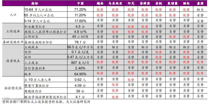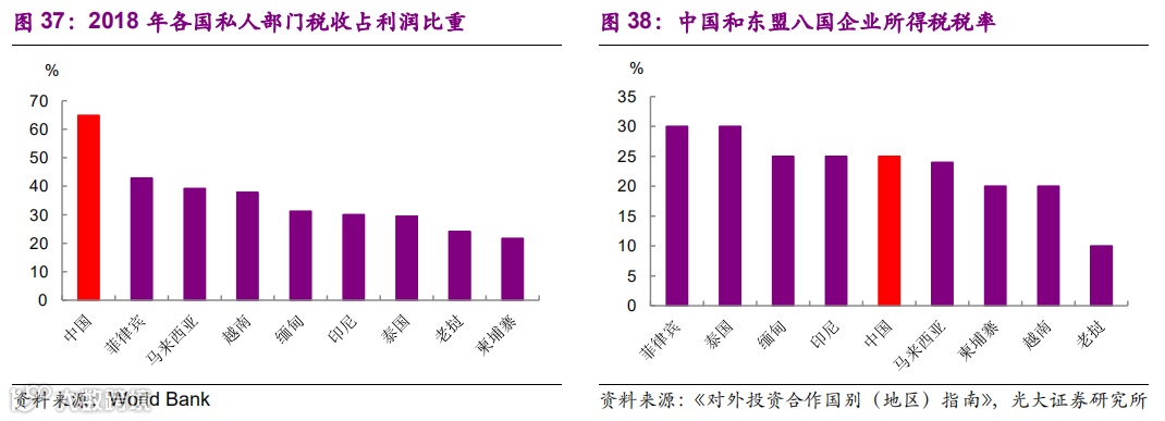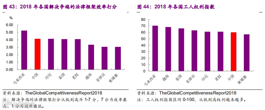 主要原因在于各国腐败较为严重,“透明国际”发布的《腐败感知指数 2018》显示, 与东盟国家相比,中国腐败感知指数为 39(分数越高腐败越少),仅低于马来西亚,而印尼、越南、老挝、泰国、柬埔寨、菲律宾等国腐败感知指数明显低于中国,表明营商环境不及中国。