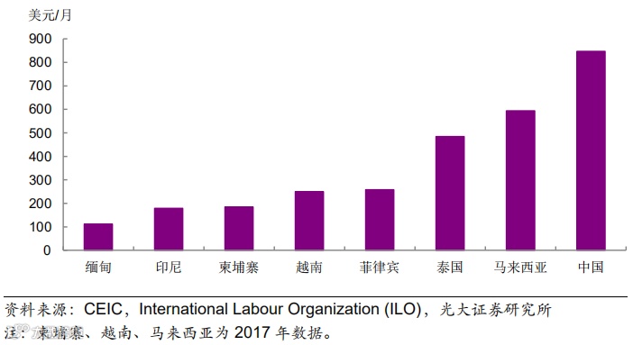 从人工成本来看,2018 年中国工人的人均月收入为 807 美元/月,东盟八国中马来西亚的人工成本最高,为594 美元/月,泰国为 484 元/月,其余国家均低于 300 美元/月,缅甸人均月收入仅为 112 美元/月。