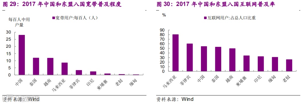 从使用宽带用户数量来看,根据 2017 年数据,中国每百人中达到 27.9 人,远高于东盟八国;