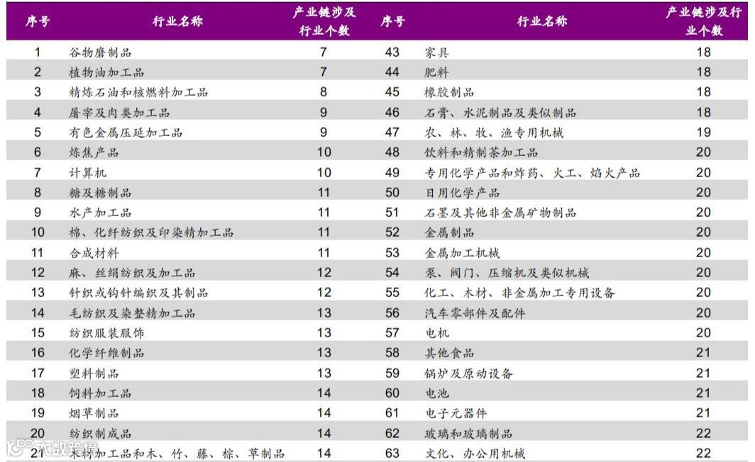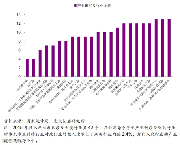 从2015年投入产出表(涉及42个大类行业)来看, 食品和烟草、纺织品的产业链似乎最短,其次是通信设备和计算机行业,再次是纺织服装、木材加工和家具行业,其他行业的上游供应链相对较长。