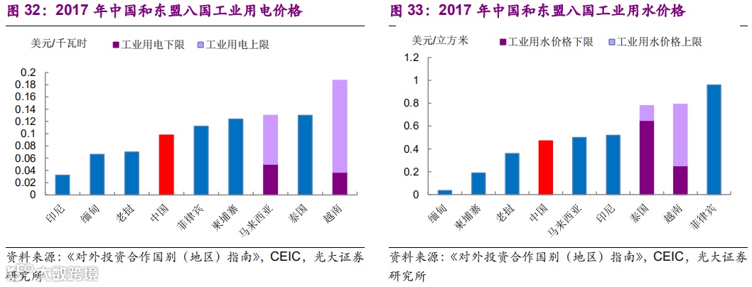 从工业用电价格来看,2018 年中国平均电费为0.10 美元/度,东盟各国中印尼(0.03 美元/度)、缅甸(0.07 美元/度)、老挝(0.07 美元/度)等三个国家低于中国,其余 5 个国家电价均高于中国(图32),用电成本相当于菲律宾的 86%、柬埔寨的 78%、泰国的 75%和越南的 65%。