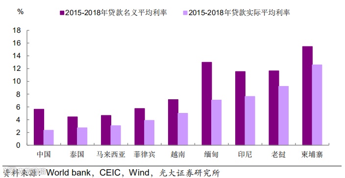 中国近四年的贷款平均名义利率为5.6%,仅高于泰国和马来西亚,其他 6 国均高于中国,最高的是柬埔寨为15.5%;从实际平均利率来看,中国要明显低于东盟八国,中国近四年的实际平均利率为 2.4%,泰国在东盟八国中最低为 2.7%,柬埔寨最高为 12.6%。