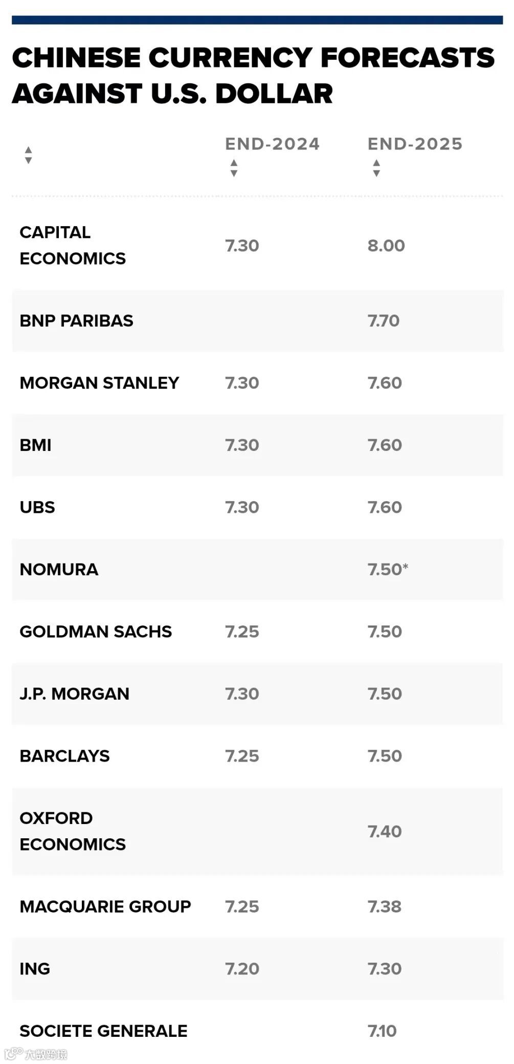 据CNBC根据13家投资银行机构对人民币的预测计算,预计到2025年底,离岸人民币对美元的平均汇率将贬值至7.51。
