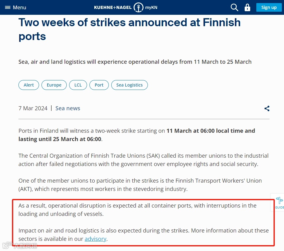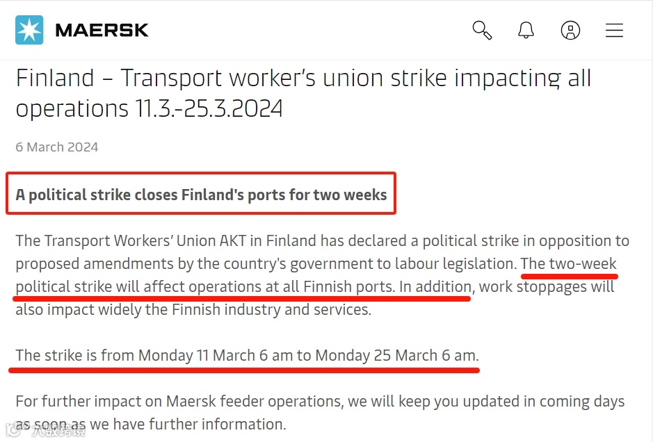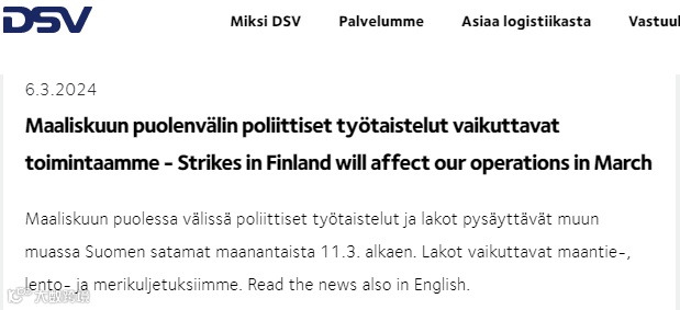 DSV也在其芬兰官网发布相关预警:芬兰的罢工将影响3月的运营。