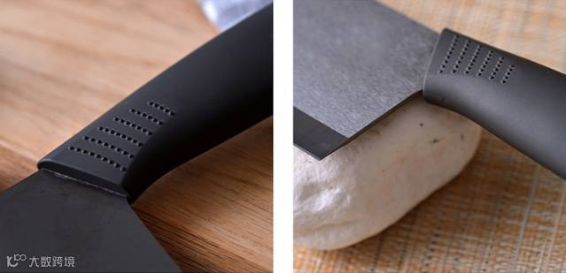 刀柄:弧形刀柄,造型流畅,符合人体工程学设计。无菌工艺的ABS注塑手柄,不含胶水更卫生。鲨鱼翅防滑设计,操作重心平稳,切食轻松自如。