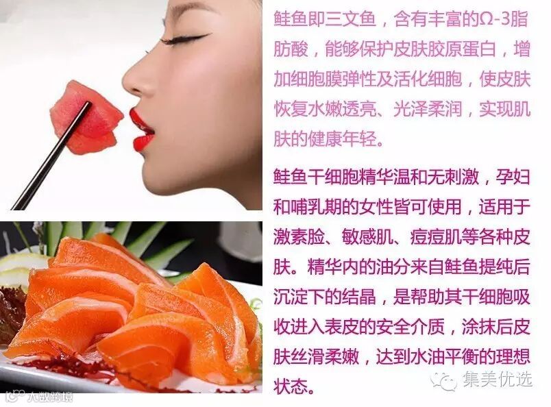 鲑鱼干细胞精华是目前最有效的医疗再生系美容成分之一,几乎能全面修复各种皮肤问题。其锁水能力高达玻尿酸的1.3倍,兼具促进胶原蛋白和玻尿酸生成的功能,在美白淡斑、抗老除皱、预防妊娠纹、愈合疤痕伤口等方面都有神奇功效,多见于高端美容院和整形医院中。