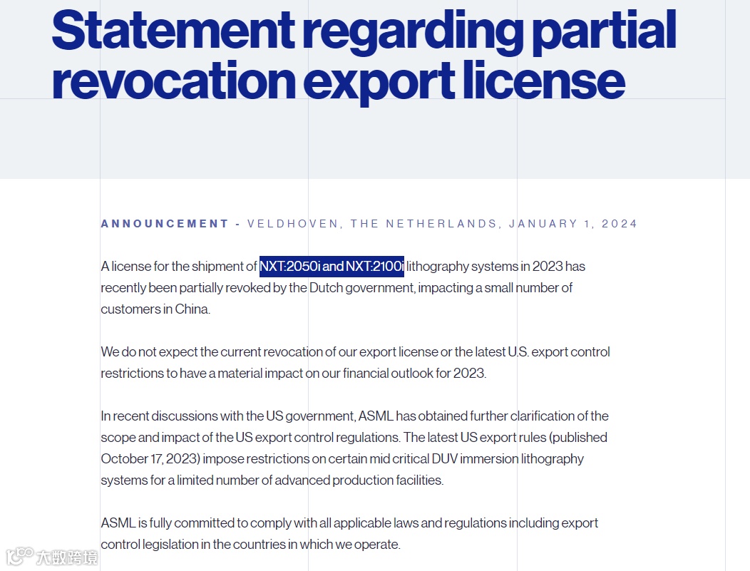 在声明中该公司还表示,在近期与ASML的沟通中,美国政府对其出口管制的适用范围和影响进行了进一步澄清。