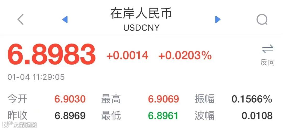 Choice数据显示,1月3日,在岸人民币对美元盘中最高触及6.8733,日内最多升值近300点;离岸人民币对美元则最高触及6.8796,日内最大涨幅逾400点。
