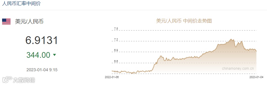 1月4日,央行授权中国外汇交易中心公布,2023年1月4日银行间外汇市场人民币汇率中间价为:1美元对人民币6.9131元,前一交易日中间价报6.9475元,单日调升344基点,连续三个交易日呈现超百基点的升值走势。