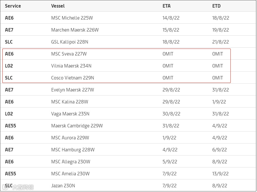 • SLC Cosco Vietnam 229N:所有进口货物在安特卫普港卸货(ETA 22/08)。在罢工结束后,货物将由Vaga Maersk 235N运输,并预计于8月30日抵达费利克斯托。