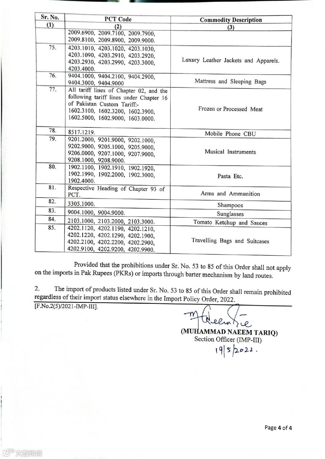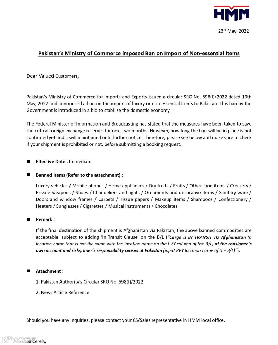 值得注意的是,如果货物的最终目的地是阿富汗,途经巴基斯坦,上述禁止进口商品是可以接受的,但需在提单上添加“In Transit Clause”(“ Cargo is IN TRANSIT TO Argentina(地名与提单PVY栏位名称)且由收货人自担风险,班轮责任终止于巴基斯坦(输入提单PVY地名)”)。