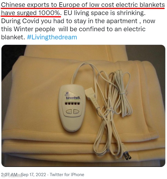 而欧洲老百姓除了买煤过冬、劈柴过冬,还在购买中国生产的电热毯、电暖气。