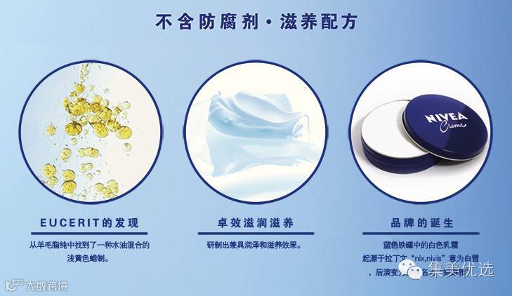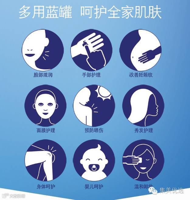 妮维雅经典蓝罐多效润肤霜,富含专利成分Eucerit和甘油,温和滋润,不含防腐剂,可当做面霜、手霜、 身体乳。能为各种肤质提供均衡滋润,全家均可使用。在英国美容测试中,曾击败海蓝之谜的神奇平价面霜,更获得了日本COSME美容大赏综合部门的第一名。